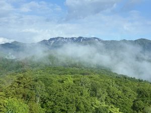 日が昇る前から残雪の山並みと美しい新緑に朝もやが流れていく幻想的な景色を眺め続けたり