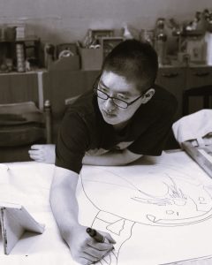 他自幼便喜欢绘画,灵感源自他所钟爱的动物和鸟类照片。绘画已经成为他日常生活的一部分。他不打草稿,而是拿起油性马克笔,根据所见照片中的信息,一气呵成地勾勒出强劲而精准的线条,仿佛被设定好的程序一般。
