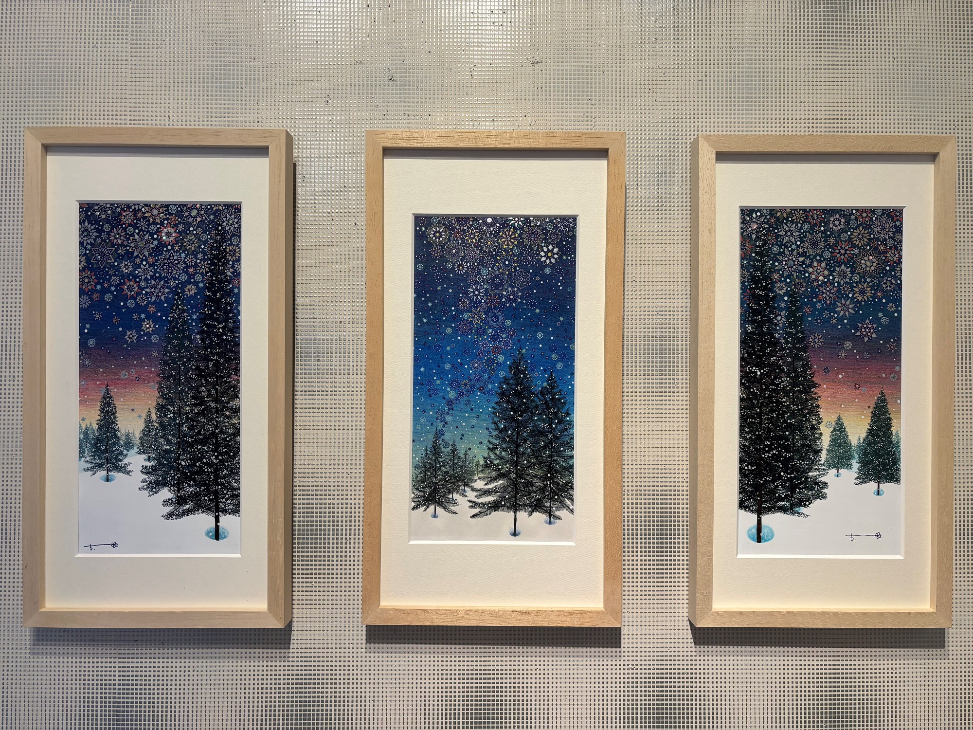 通过反复叠加彩色铅笔,她创造出复杂而细腻的色彩。她擅长描绘精致的图案,有时还会融入螺钿工艺。她根据每件作品的特质,选择并结合最契合的材料,如丙烯颜料与凝胶笔等,探索多样化的表现方式。她发现了以国产楮树原料(100%产自高知县)制作的和纸之美,并亲自为作品装裱,使画框与作品融为一体。
